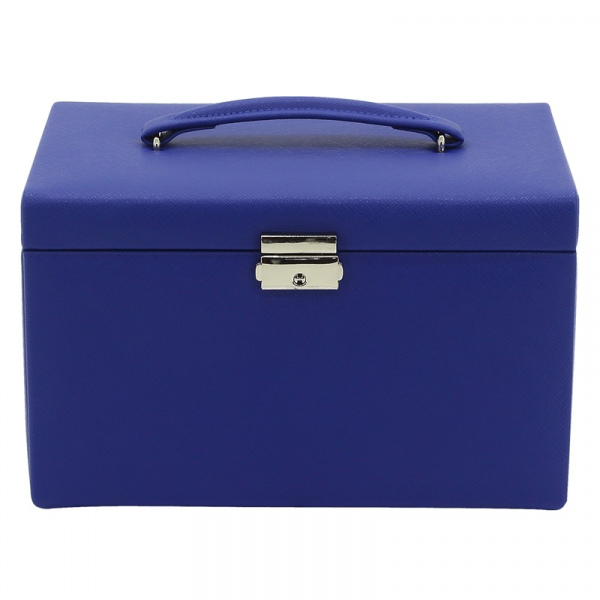 Šperkovnice ze syntetické kůže, vzor příčných vláken - barva: modrá, vnitřní materiál je velur v béžové barvě, je uzamykatelná, 4 patra pro uložení šperků, zrcadlo na vnitřní straně víka.