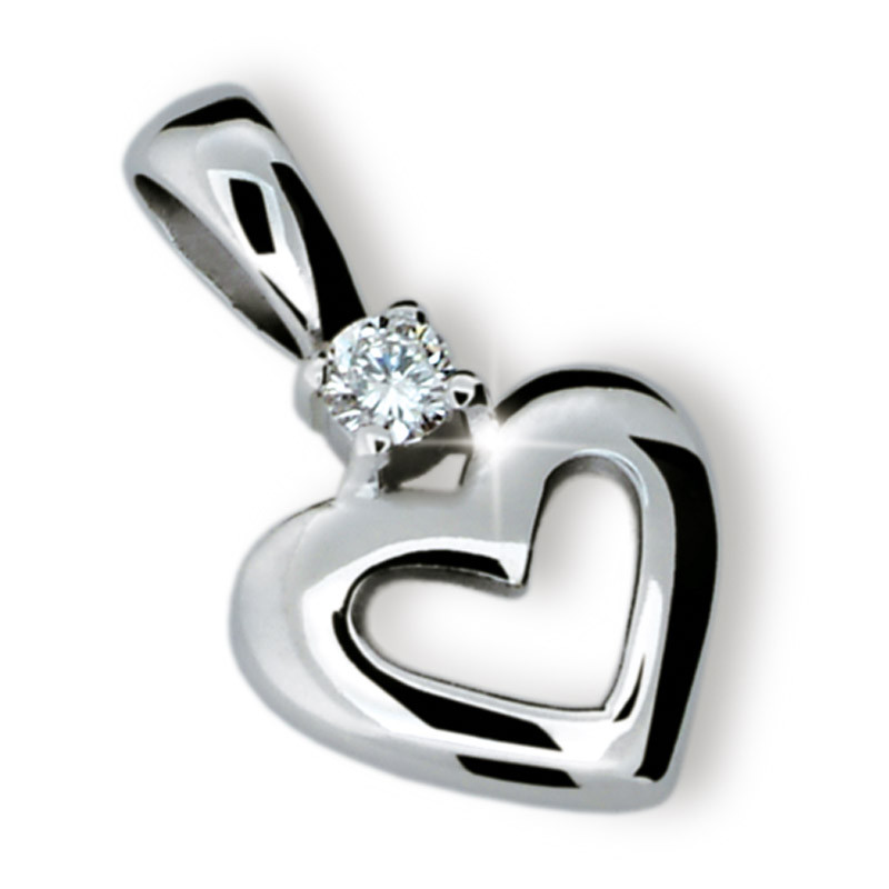 Luxusní přívěsek ve tvaru srdíčka z bílého 14 karátového zlata doplněný zářivým diamantem 0.06 ct kulatého brusu. Přívěsek má lesklý, sněhově bílý povrch. Šperk je uložen v luxusní dárkové krabičce spolu s certifikátem pravosti.