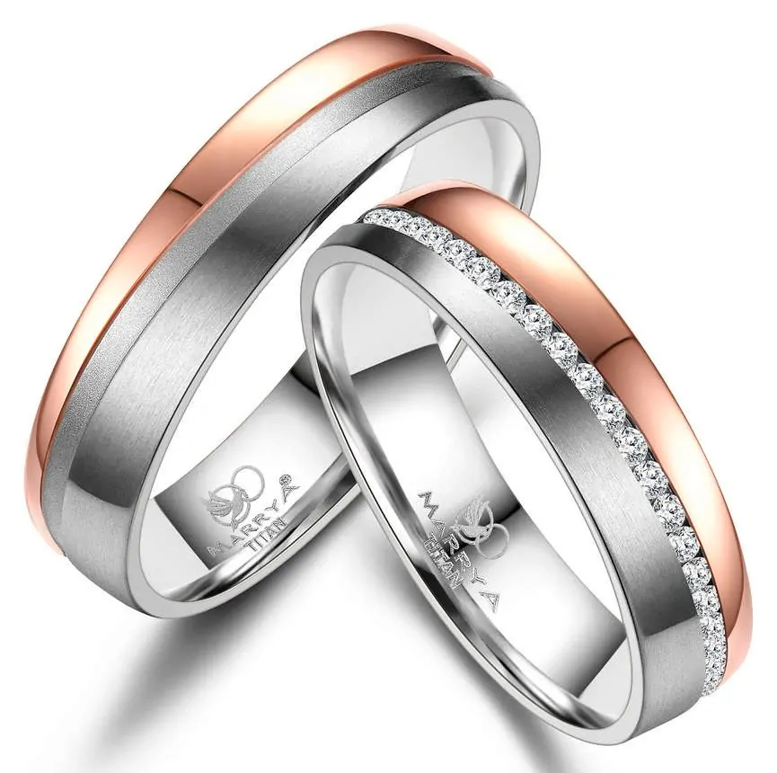 Snubní prsteny z titanu půlkulatého profilu s lesklou-Matnou povrchovou úpravou. V dámském prstenu jsou vsazeny zirkony.