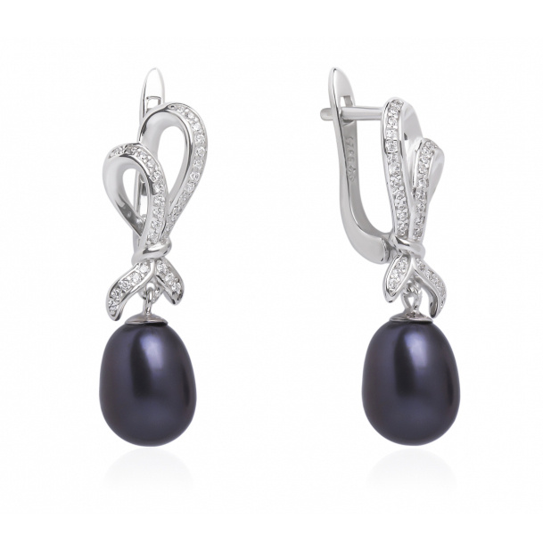 Velice krásně zpracované stříbrné náušnice s jednoduchým francouzským zapínáním (známé jako ruské zapínání). V náušnicích skvostně dominuje přírodní černá perla ve tvaru kapky. Perla je zavěšena na stříbrné ozdobě s motivem dvou mašlí s lesklými zirkony.