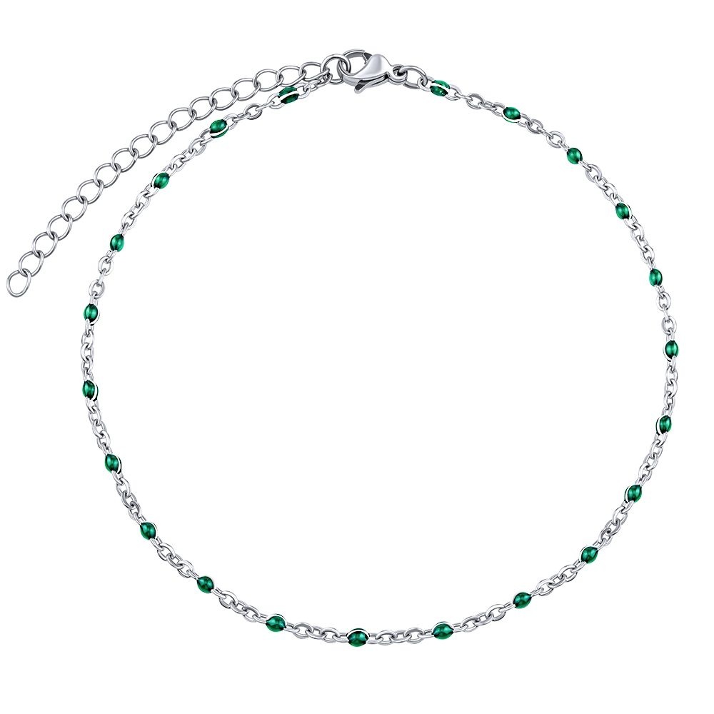 Řetízek je elegantně pravidelně zdoben tmavě zelenými kuličkami.